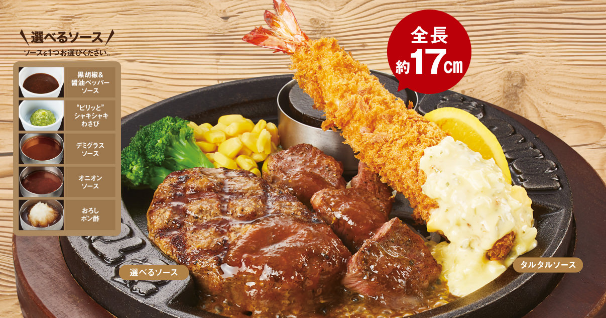 "牛肉100%!!" 弾丸ハンバーグ&ビフテキ&ジャンボ海老フライ