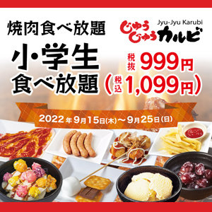 2022.09.07 じゅうじゅうカルビ 9/15~9/25期間限定!!小学生999円(税込1.099円) 「お気軽」「大感激」「フル」「国産牛&ミスジ」のコースご注文で 小学生は1.099円(税込)でご注文いただけます。 お子様も食欲の秋です、期間が短いのでお早めに!!