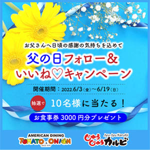 2022.06.03 じゅうじゅうカルビ 6/19は父の日!お父さんに日頃の感謝を込めて、トマト&オニオン・じゅうじゅうカルビ合同インスタグラムキャンペーンを開催いたします!フォロー&キャンペーンの投稿にいいね!で応募してください。抽選で10名様にじゅうカルお食事券をプレゼント!!