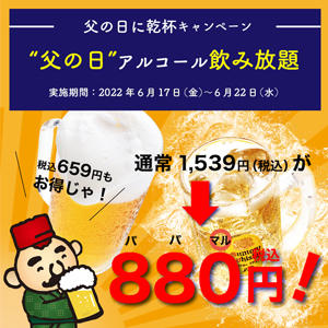 2022.06.13 じゅうじゅうカルビ 毎日頑張っているお父さんに感謝とエールを込めて父の日に合わせてアルコールイベントを企画しました。じゅうじゅうカルビのアルコール飲み放題は、生ビールやハイボールなど40種類以上から楽しめます。 期間中は、通常価格より税込659円お得な税込880円で販売し、さらに檸檬堂のこだわりレモンサワー3種(定番・鬼レモン・はちみつレモン)もご注文ができます。