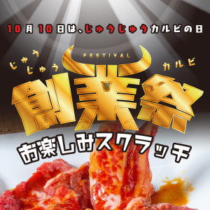 2021.10.01 じゅうじゅうカルビ 「創業祭クイズキャンペーン開催♪正解者の中から抽選で10名様に3,000円分のお食事券をプレゼント!クイズに答えてお食事券をGETしよう!応募締め切り:2021年10月17日」